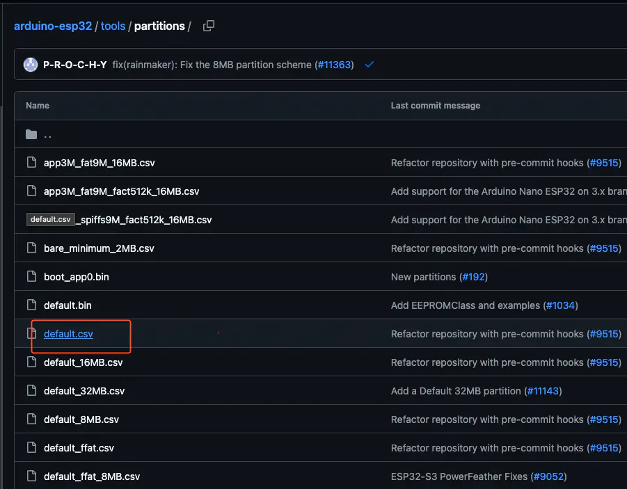 在官方仓库中获取默认分区表:https://github.com/espressif/arduino-esp32/tree/master/tools/partitions